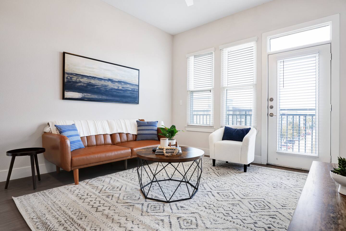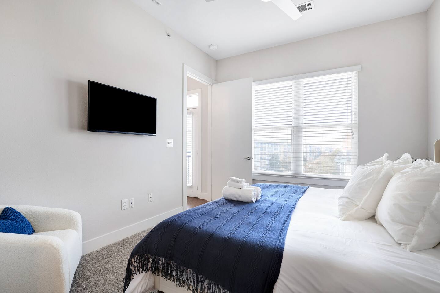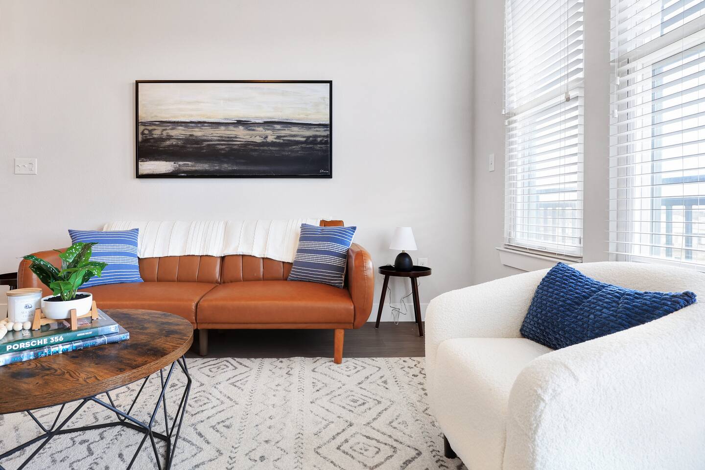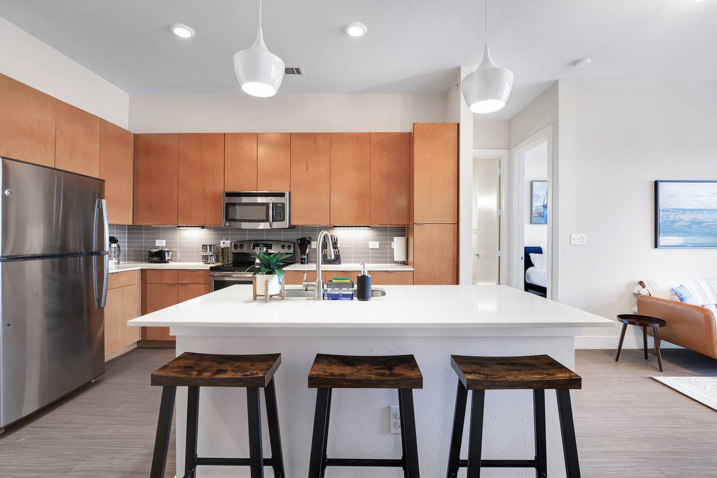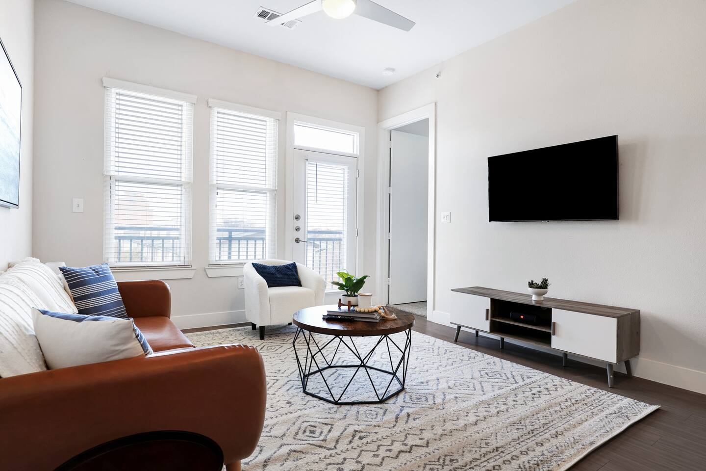 Prime Location: Nestled in a tranquil neighborhood, our apartment is a stone's throw away from the bustling Riverwalk, offering easy access to its array of shops, restaurants, and entertainment options. Comfortable Living Space: Enjoy a spacious living room with modern décor, a 4K Smart TV, and complimentary high-speed Wi-Fi, ideal for relaxation or working remotely . Fully Equipped Kitchen: Whether you're whipping up breakfast or preparing a romantic dinner, our kitchen has everything you need, from stainless steel appliances to cookware and utensils. Luxurious Bedrooms : Drift off to sleep in the king-size bed and queen-size bed with premium bedding and wake up refreshed to start your day exploring what San Antonio has to offer. Bathroom Amenities: Both bathrooms are stocked with fluffy towels, toiletries, and a hairdryer for your convenience. Exclusive Guest Amenities: • Keyless Entry System for Secure and Convenient Access • Climate Control for Your Comfort • In-Unit Laundry Facilities • Complimentary Parking Space • Detailed Guidebook with Local Recommendations • 4K HDTVs with Netflix • High-speed WiFi • Laptop friendly workspace • Ideal for long-term stays • Washer + dryer w/ detergent • Dishwasher w/ detergent • Keurig with coffee • Central A/C & Heat • Community pool, fitness center, grill area • E-Bike Share station ($) + Walking/Biking trail • Free parking Explore Nearby: • San Antonio Riverwalk (0.3 miles): Just a short walk away, explore this famed attraction that winds through the city center, offering a unique blend of cultural experiences, dining, and entertainment. • The Alamo (0.8 miles): Dive into history at this iconic mission, a testament to Texas' spirit and independence. • Pearl District (1.2 miles): Discover the culinary and cultural hub of San Antonio, with its vibrant farmers' market, boutiques, and eateries. • Museums & Art (0.6 miles): Visit the San Antonio Museum of Art and the Briscoe Western Art Museum for a dose of creativity and inspiration. Guest Experience: Our commitment to your comfort is paramount. From the moment you book to the time you check out, we ensure a seamless and personalized experience. Our apartment is professionally cleaned and prepared for each guest, adhering to the highest standards of cleanliness and hospitality.