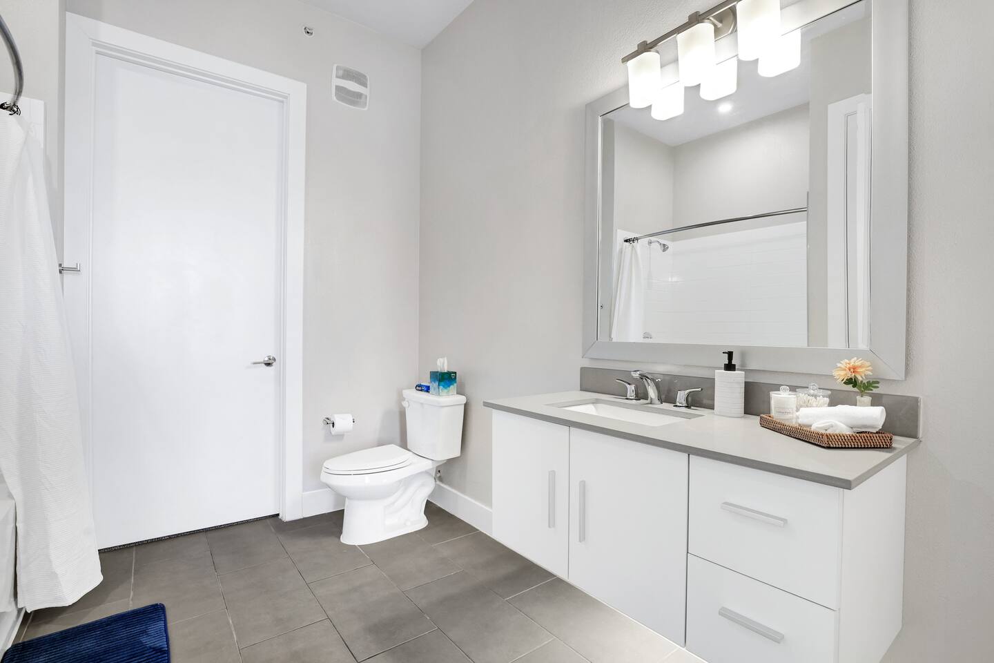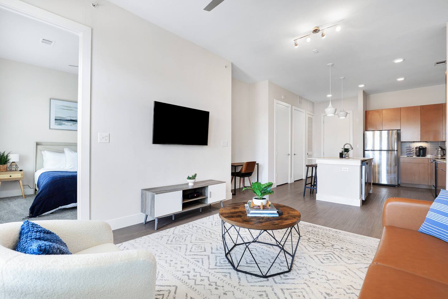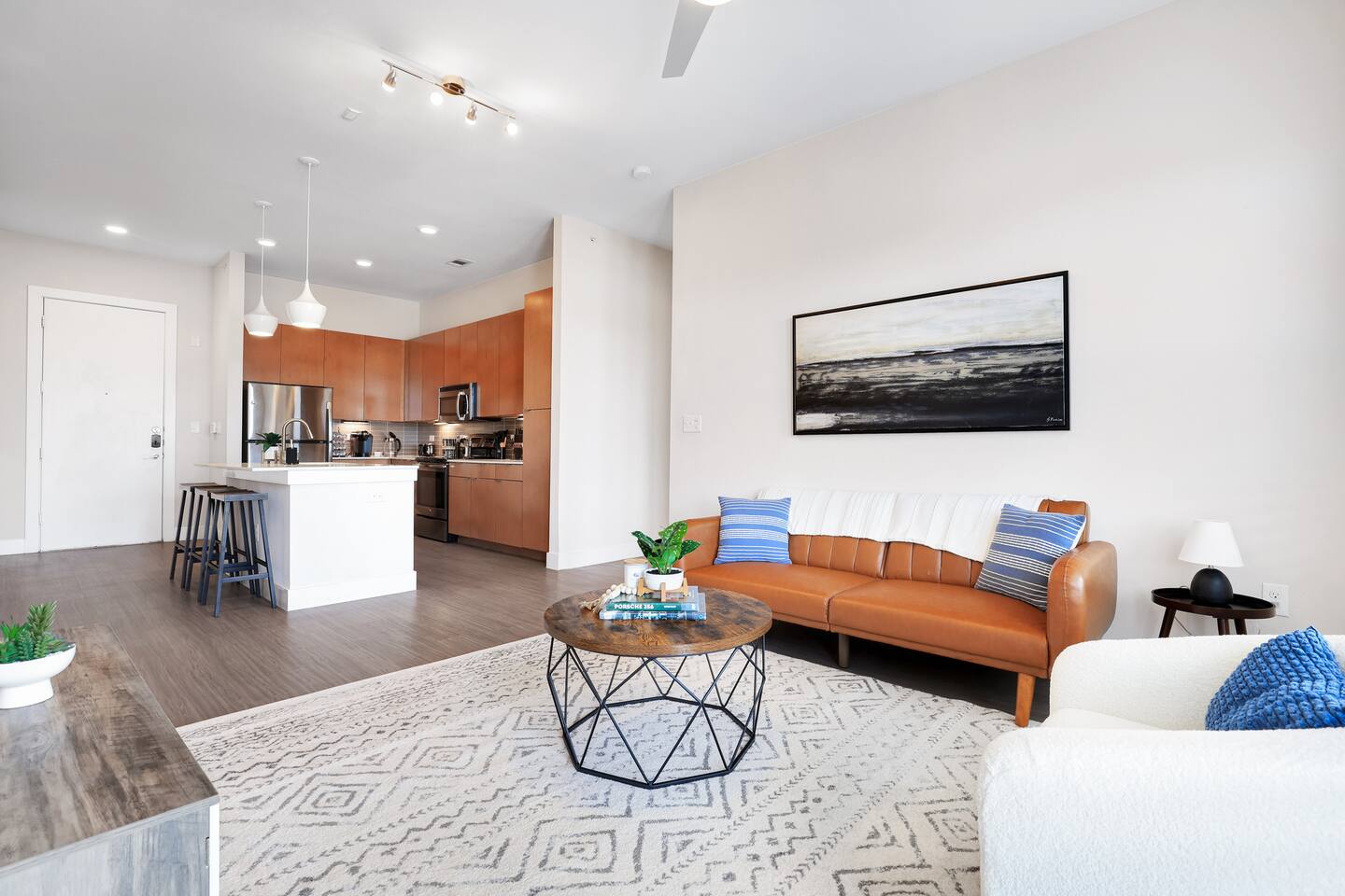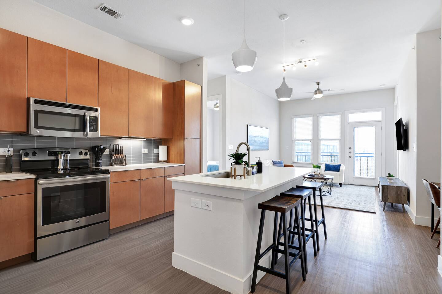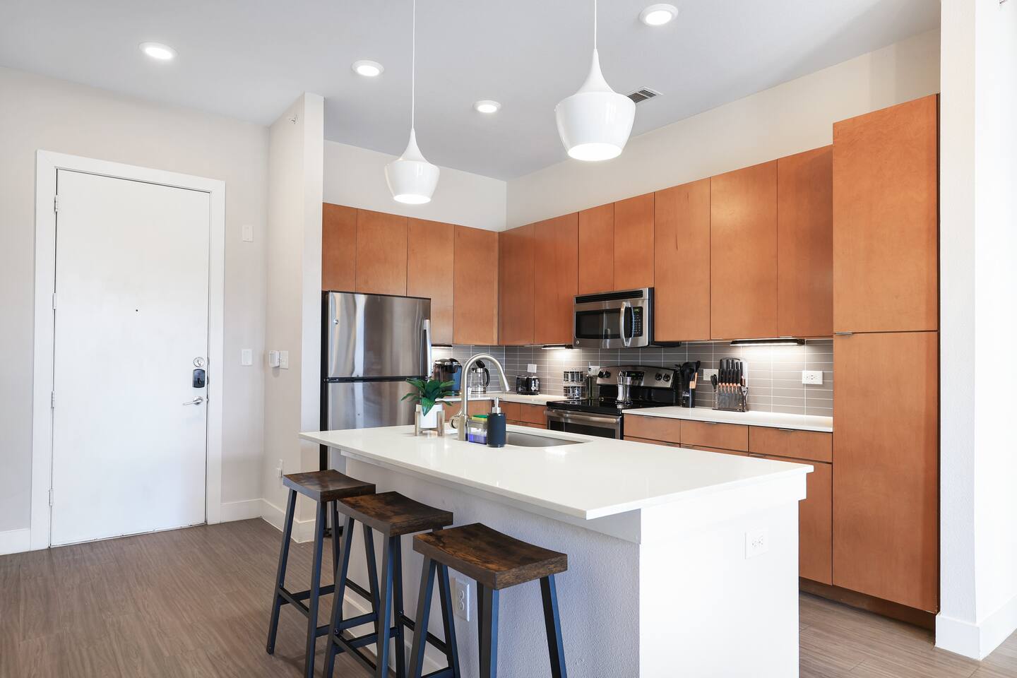Prime Location: Nestled in a tranquil neighborhood, our apartment is a stone's throw away from the bustling Riverwalk, offering easy access to its array of shops, restaurants, and entertainment options. Comfortable Living Space: Enjoy a spacious living room with modern décor, a 4K Smart TV, and complimentary high-speed Wi-Fi, ideal for relaxation or working remotely . Fully Equipped Kitchen: Whether you're whipping up breakfast or preparing a romantic dinner, our kitchen has everything you need, from stainless steel appliances to cookware and utensils. Luxurious Bedrooms : Drift off to sleep in the king-size bed and queen-size bed with premium bedding and wake up refreshed to start your day exploring what San Antonio has to offer. Bathroom Amenities: Both bathrooms are stocked with fluffy towels, toiletries, and a hairdryer for your convenience. Exclusive Guest Amenities: • Keyless Entry System for Secure and Convenient Access • Climate Control for Your Comfort • In-Unit Laundry Facilities • Complimentary Parking Space • Detailed Guidebook with Local Recommendations • 4K HDTVs with Netflix • High-speed WiFi • Laptop friendly workspace • Ideal for long-term stays • Washer + dryer w/ detergent • Dishwasher w/ detergent • Keurig with coffee • Central A/C & Heat • Community pool, fitness center, grill area • E-Bike Share station ($) + Walking/Biking trail • Free parking Explore Nearby: • San Antonio Riverwalk (0.3 miles): Just a short walk away, explore this famed attraction that winds through the city center, offering a unique blend of cultural experiences, dining, and entertainment. • The Alamo (0.8 miles): Dive into history at this iconic mission, a testament to Texas' spirit and independence. • Pearl District (1.2 miles): Discover the culinary and cultural hub of San Antonio, with its vibrant farmers' market, boutiques, and eateries. • Museums & Art (0.6 miles): Visit the San Antonio Museum of Art and the Briscoe Western Art Museum for a dose of creativity and inspiration. Guest Experience: Our commitment to your comfort is paramount. From the moment you book to the time you check out, we ensure a seamless and personalized experience. Our apartment is professionally cleaned and prepared for each guest, adhering to the highest standards of cleanliness and hospitality.