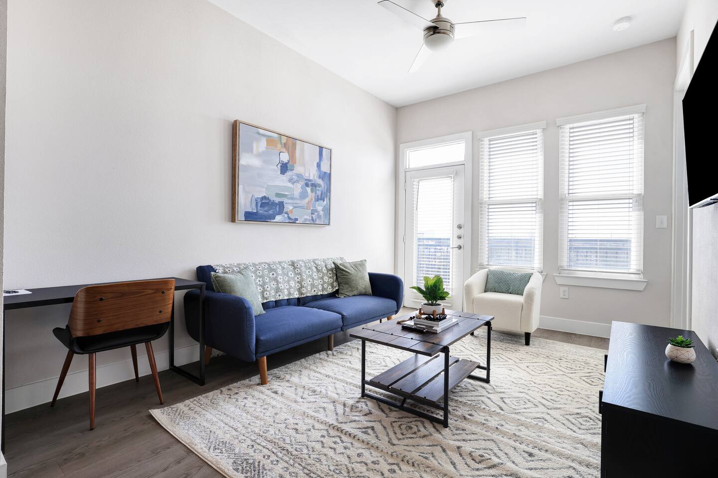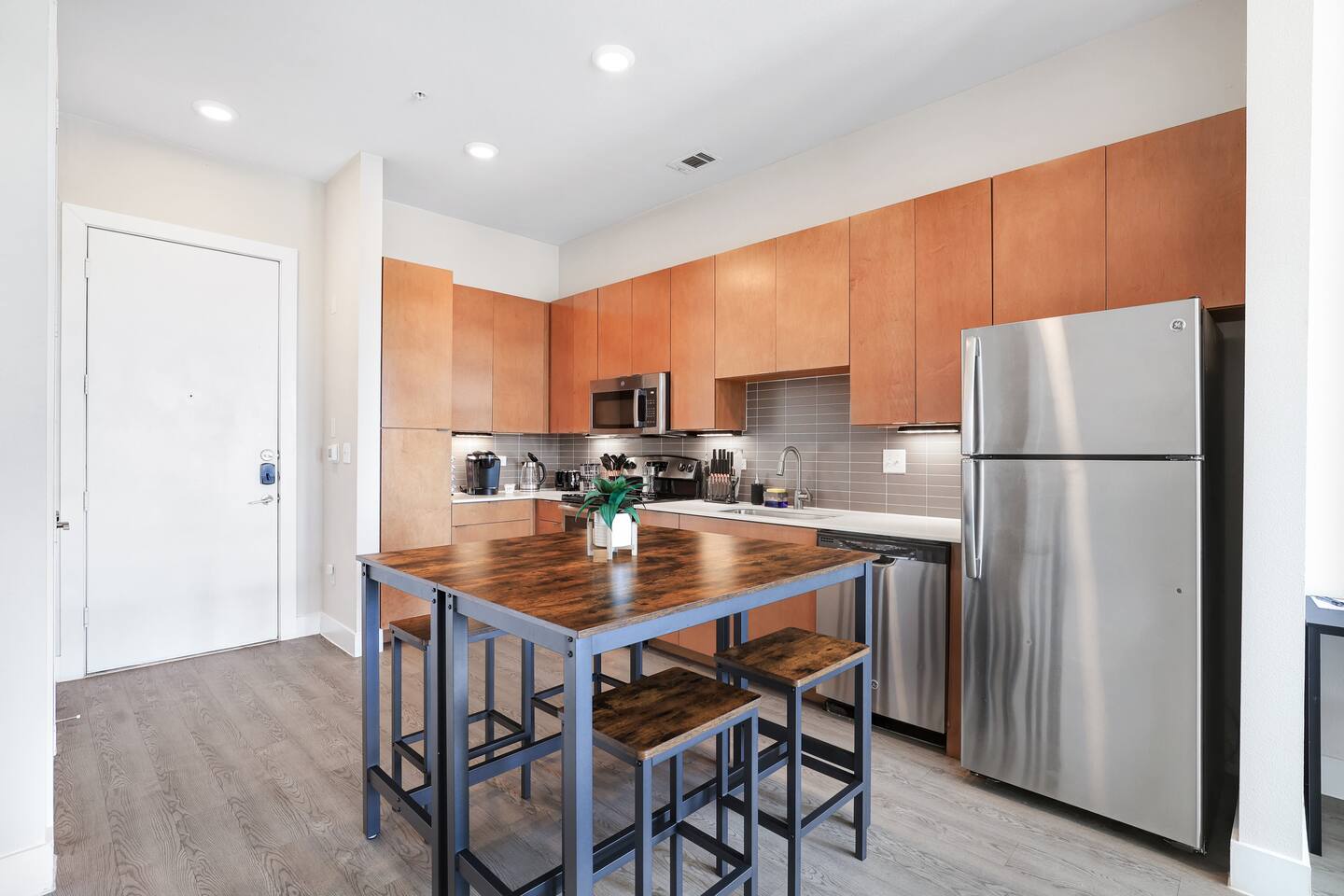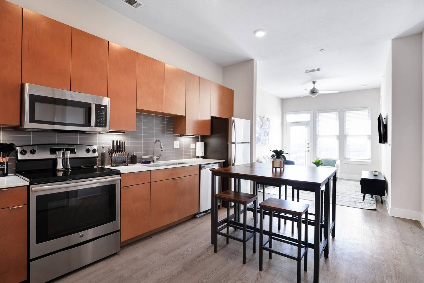 Prime Location: Nestled in a tranquil neighborhood, our apartment is a stone's throw away from the bustling Riverwalk, offering easy access to its array of shops, restaurants, and entertainment options. Comfortable Living Space: Enjoy a spacious living room with modern décor, a 4K Smart TV, and complimentary high-speed Wi-Fi, ideal for relaxation or working remotely . Fully Equipped Kitchen: Whether you're whipping up breakfast or preparing a romantic dinner, our kitchen has everything you need, from stainless steel appliances to cookware and utensils. Luxurious Bedroom: Drift off to sleep in the king-size bed with premium bedding and wake up refreshed to start your day exploring what San Antonio has to offer. Bathroom Amenities: The bathroom is stocked with fluffy towels, toiletries, and a hairdryer for your convenience. Exclusive Guest Amenities: • Keyless Entry System for Secure and Convenient Access • Climate Control for Your Comfort • In-Unit Laundry Facilities • Complimentary Parking Space • Detailed Guidebook with Local Recommendations • 4K HDTVs with Netflix • High-speed WiFi • Laptop friendly workspace • Ideal for long-term stays • Washer + dryer w/ detergent • Dishwasher w/ detergent • Keurig with coffee • Central A/C & Heat • Community pool, fitness center, grill area • E-Bike Share station ($) + Walking/Biking trail • Free parking Explore Nearby: • San Antonio Riverwalk (0.3 miles): Just a short walk away, explore this famed attraction that winds through the city center, offering a unique blend of cultural experiences, dining, and entertainment. • The Alamo (0.8 miles): Dive into history at this iconic mission, a testament to Texas' spirit and independence. • Pearl District (1.2 miles): Discover the culinary and cultural hub of San Antonio, with its vibrant farmers' market, boutiques, and eateries. • Museums & Art (0.6 miles): Visit the San Antonio Museum of Art and the Briscoe Western Art Museum for a dose of creativity and inspiration. Guest Experience: Our commitment to your comfort is paramount. From the moment you book to the time you check out, we ensure a seamless and personalized experience. Our apartment is professionally cleaned and prepared for each guest, adhering to the highest standards of cleanliness and hospitality.